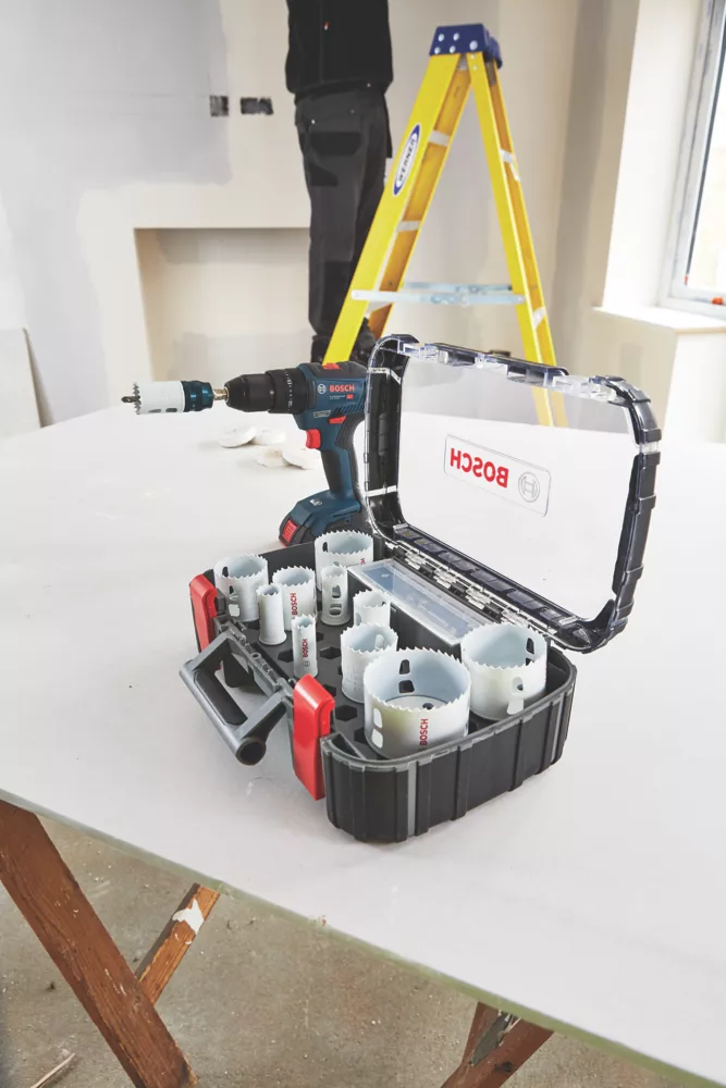 Holesaw kit for cutting multi materials. HSS bi-metal construction with 8% cobalt alloy for extreme resilience and long life time. Progressive tooth strip for high cutting performance and fast chip clearance. Power change adaptor for fast and safe attachment and release of the pilot drill bit and holesaw with just one click.