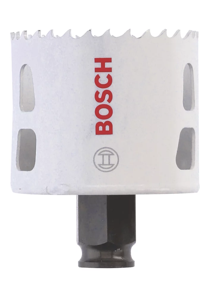 Power-change holesaw and adaptor for a fast and safe attachment and release of the pilot drill bit and holesaw, with just one click. Progressive tooth strip provides optimal cutting performance and fast chip clearance. HSS bi-metal with 8% cobalt alloy, enlarged HSS stripe and redesigned teeth ensures extreme durability.