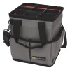Tough and durable, polyester fabric reinforced with extra metal rivets and leather on friction points. With an ergonomic padded belt with breathable mesh for maximum comfort when holding heavy loads. With tool slots and holders, and a large zipped pocket suitable for wallets, keys and mobile phones. Includes steel D-ring loops for use with braces and karabiners.