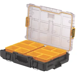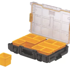 Organiser with seal for protection from water and dust. Robust, clear polycarbonate cover provides impact resistance. Large, heavy duty metal latches keep the lid securely closed and auto-lock side latch enables single handed operation. Stackable and can be easily clicked onto any module of the DeWalt ToughSystem range. Supplied with 8 x small and 4 x large storage cups with flexibility to make smaller cups by adding dividers. Can also be removed for ease of access and fit into the DeWalt Nail Pouch.