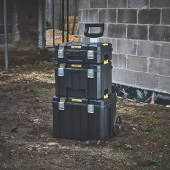 Bundle combines wheeled mobile storage with a deep storage box and shallow box organiser. Features heavy duty metal hinges and latches for longer life and durability. Bi-material telescopic handle. Durable wheels allow heavy tools to be transported easily across longer distances. Compatible with TSTAK.