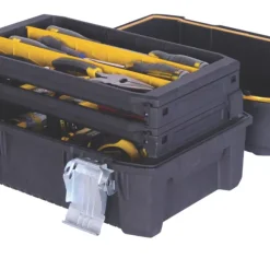 Customisable tool box features metal-pin side stacking latches for longer life and increased durability and IP54 waterseal providing water and dust protection. Internal fixing point allows DeWalt tracker to be installed and box-tracked via DeWalt Tool Connect. Latest upgrade to the TSTAK interlocking portable storage range.