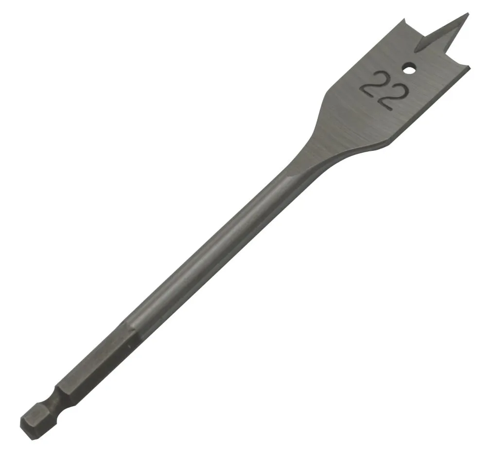 “ΒΌ” Hex Shank. Good quality flat bits. 3-point cutting head for clean, large diameter drilling in wood. Use with hand or power tools. Angled cutting edges give faster, cleaner cutting.