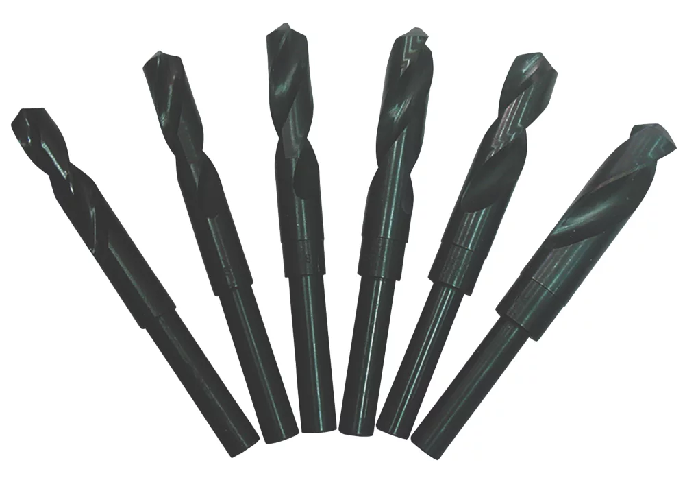 Large diameter bits with smaller shanks to enable use in standard drill chucks. Suitable for steel, cast iron, malleable iron, non-ferrous materials and plastics.