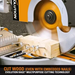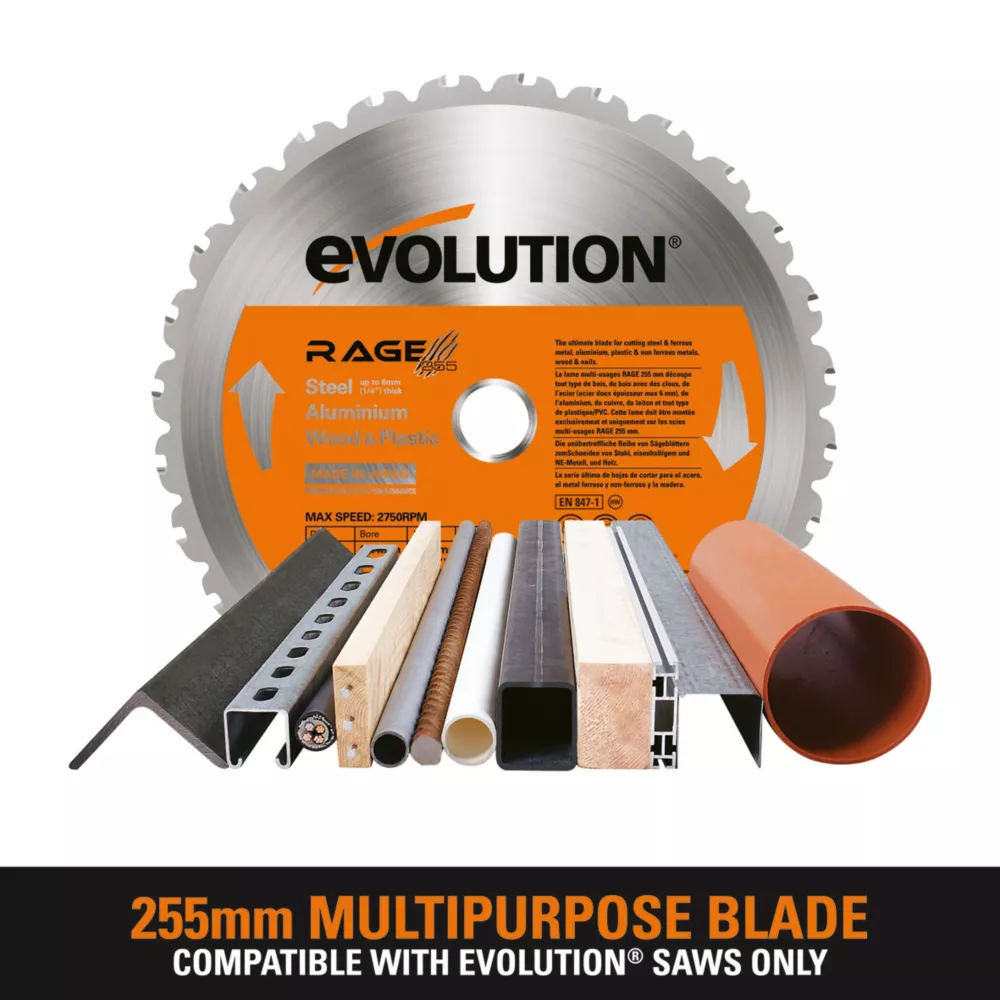 Cost-effective blade featuring RAGE technology. For cutting steel, aluminium, wood and plastic. Cuts nail-embedded wood easily and cuts steel with virtually no sparks or heat. Collects most wood and metal chipping automatically. Only suitable for use with Evolution circular and mitre saws.