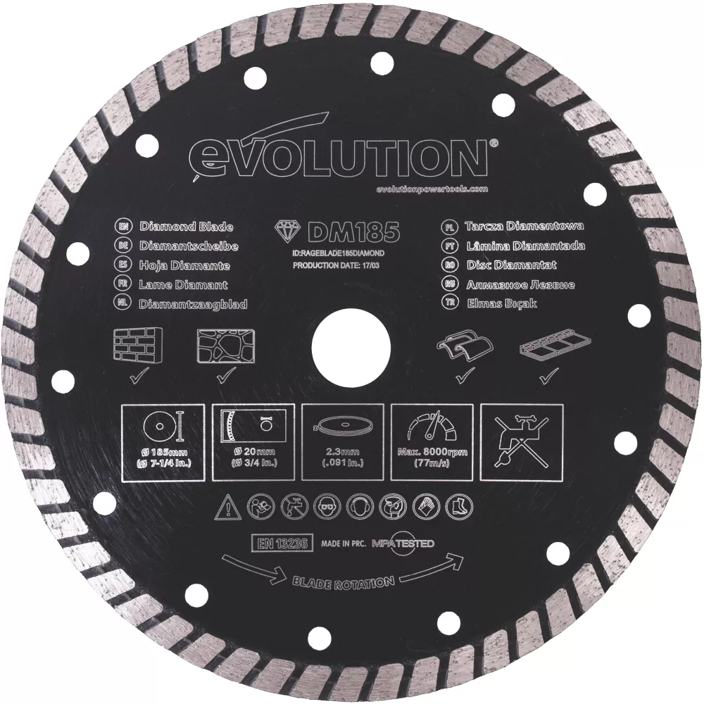 Segmented diamond saw blade with hardened body for fast, clean and accurate cutting of brick, concrete and stone. Features a high concentration of diamond for longevity and a hot-pressed turbo segmented rim for consistent cutting ability. For dry use only.