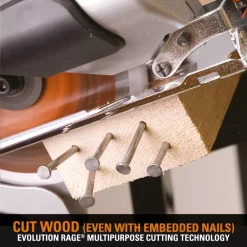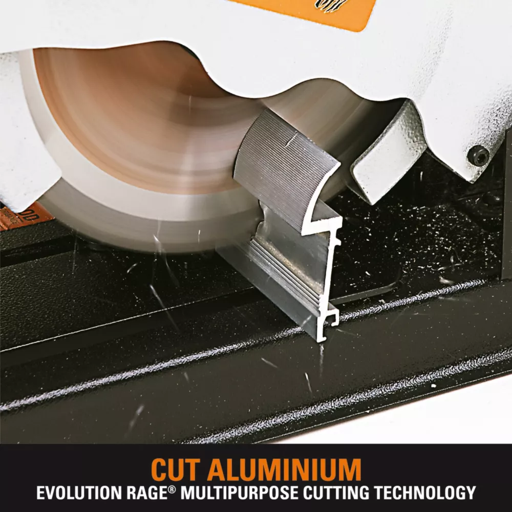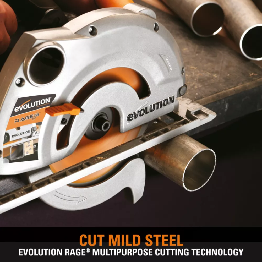 Cost-effective blade featuring RAGE technology. For cutting steel, aluminium, wood and plastic. Cuts nail-embedded wood easily and cuts steel with virtually no sparks or heat. Collects most wood and metal chipping automatically. Only suitable for use with Evolution circular and mitre saws.
