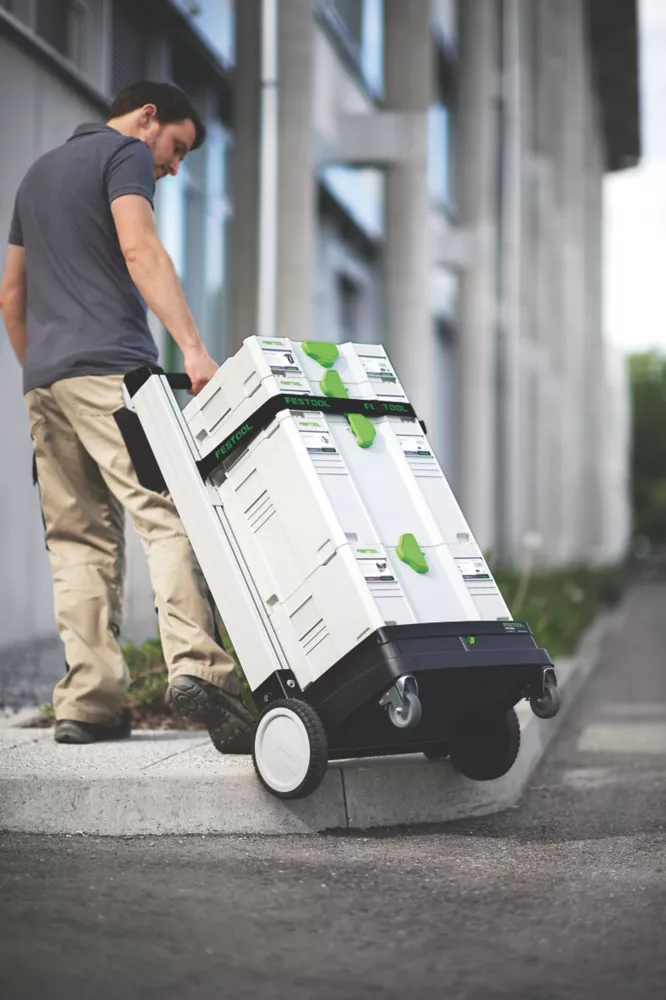 Lightweight tool storage and transportation system with drawer for storing accessories and small parts. Provides a simple, convenient means to get Festool T-LOCs and Systainers to and from the worksite. Not compatible with SYS-MINI, SYS-MIDI, and SYS-MAXI Systainers. Sack barrow function for the construction site and roll board function for the workshop. Large rear wheels make for easy transportation up and down steps and lockable front rollers manoeuvre in all directions.