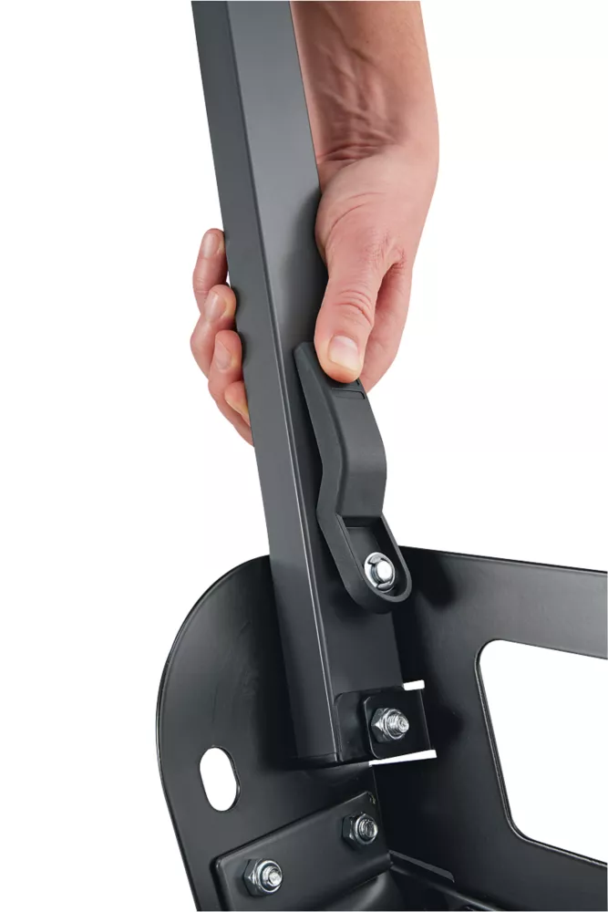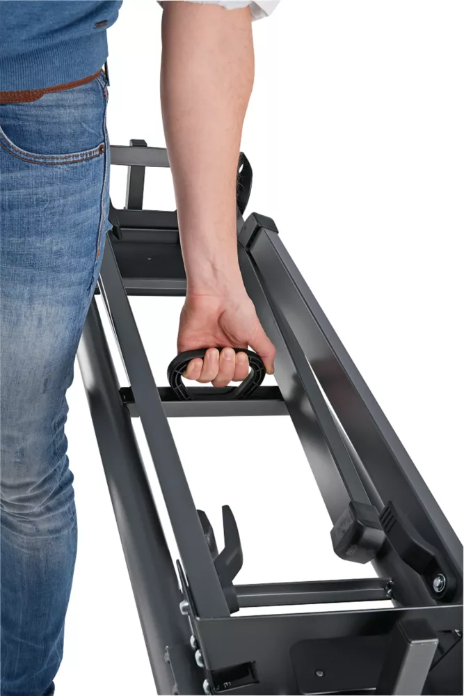 Base frame for the Flex SMS 190 18.0-ECS. Extendable on both sides, with an adjustable levelling foot. Height-adjustable workpiece support with saw stop, left/right tool trays and mounting plates with quick-release clamps. Can be folded without tools for transport. Supplied with carry handle.