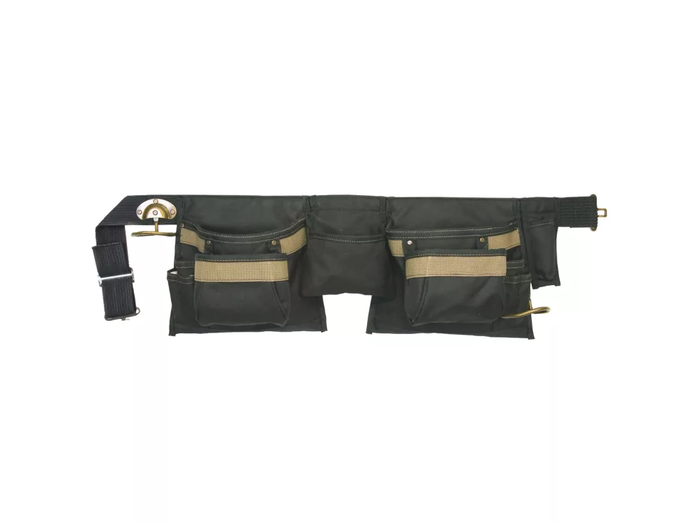 Carpenters apron made from heavy duty 600 denier polyester fabric and 1680 denier ballistic nylon backing. Pockets with reversed construction for improved storage and capacity. 2″ wide polyweb belt with steel buckle fits waists sizes from 36 to 46″.