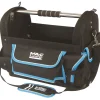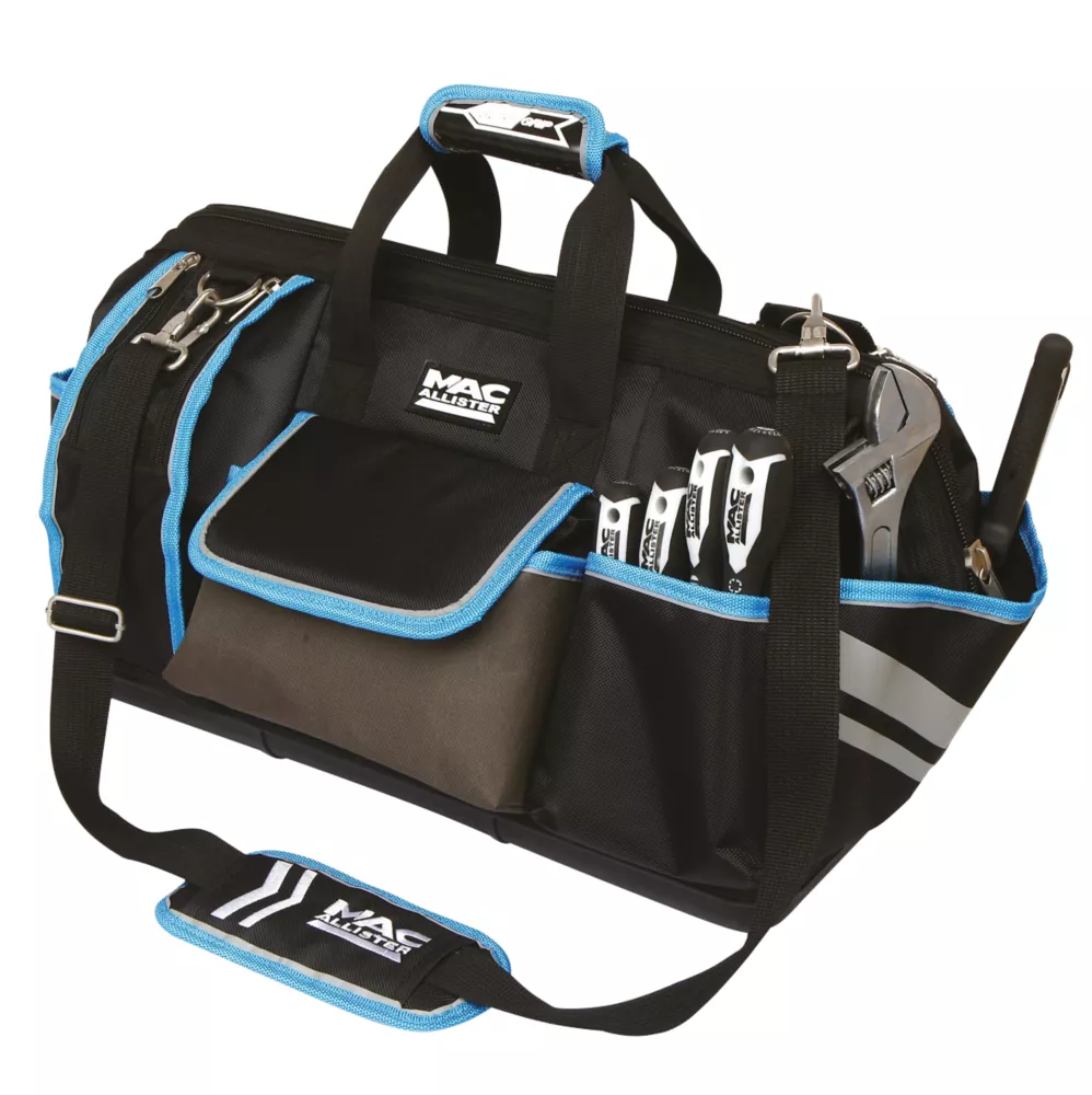 Polyester tool bag with reinforced rubber base. Top-opening zip with a wide mouth for easy access. Mesh pockets for small tools and accessories. Adjustable strap. Ideal for carrying hand tools.