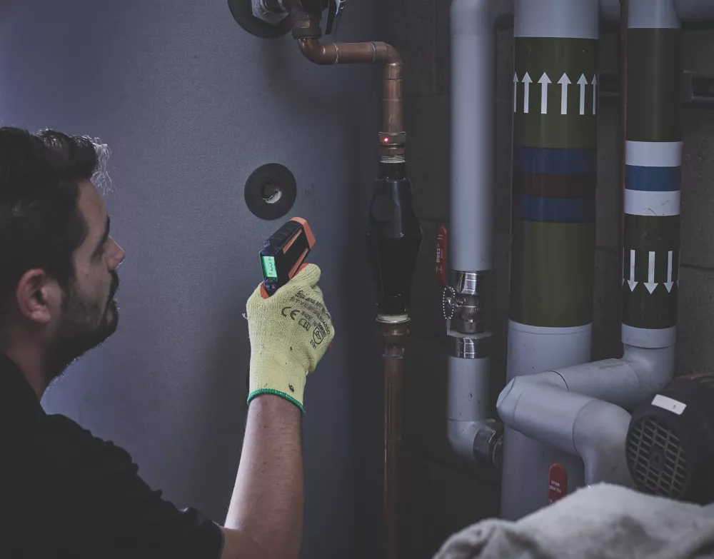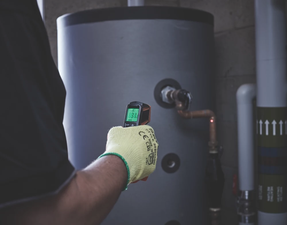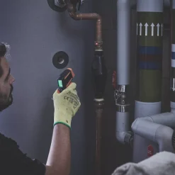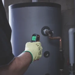 Non-contact digital thermometer with ergonomic handle and automatic laser level. Measures temperature for the target point. Battery-powered.