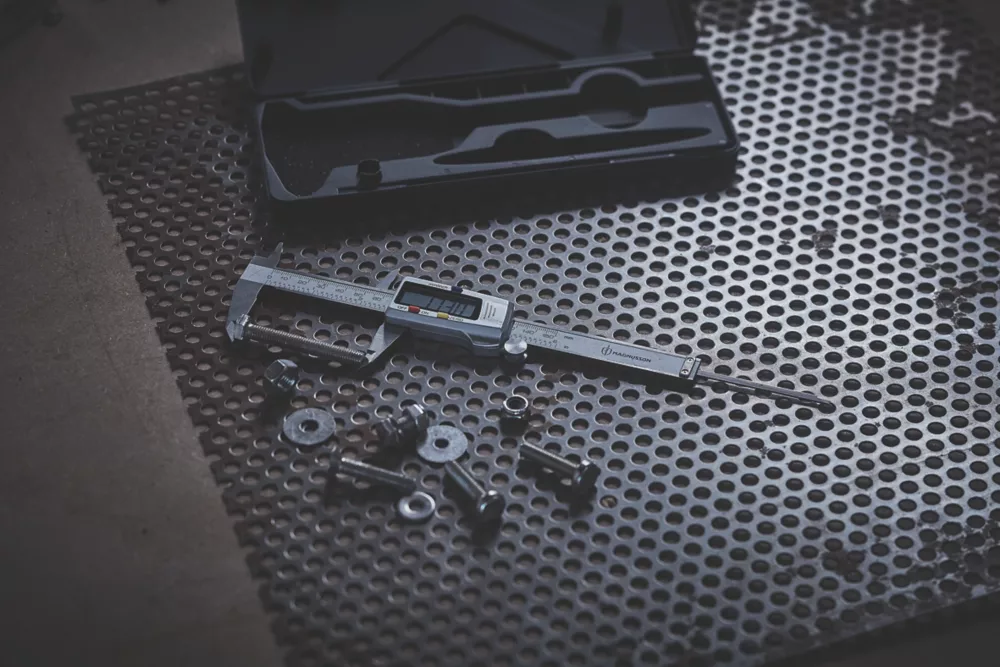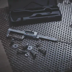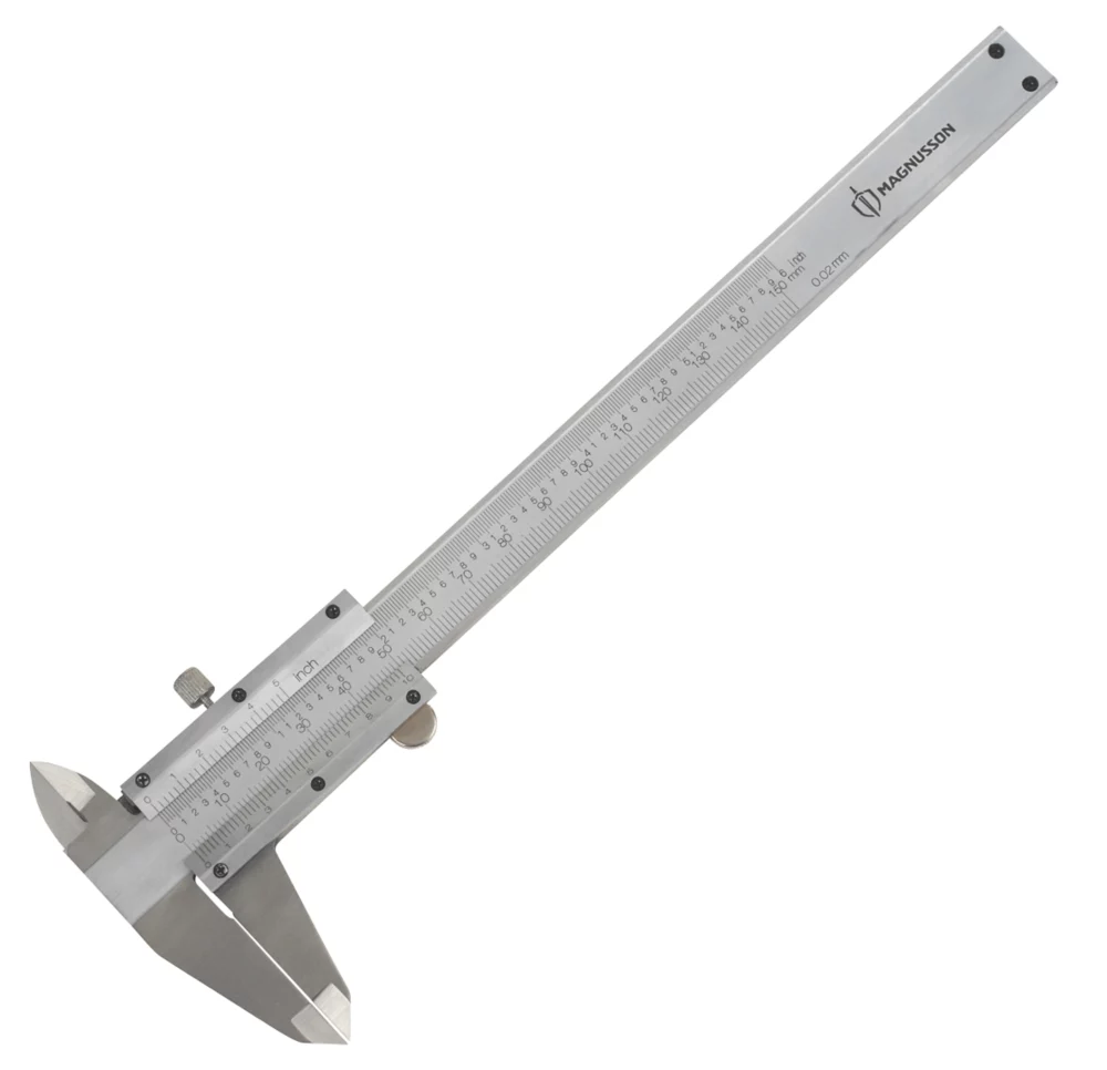 4-way metric measurement including internal, external, depth and stop. Vernier scale. Plastic case included.