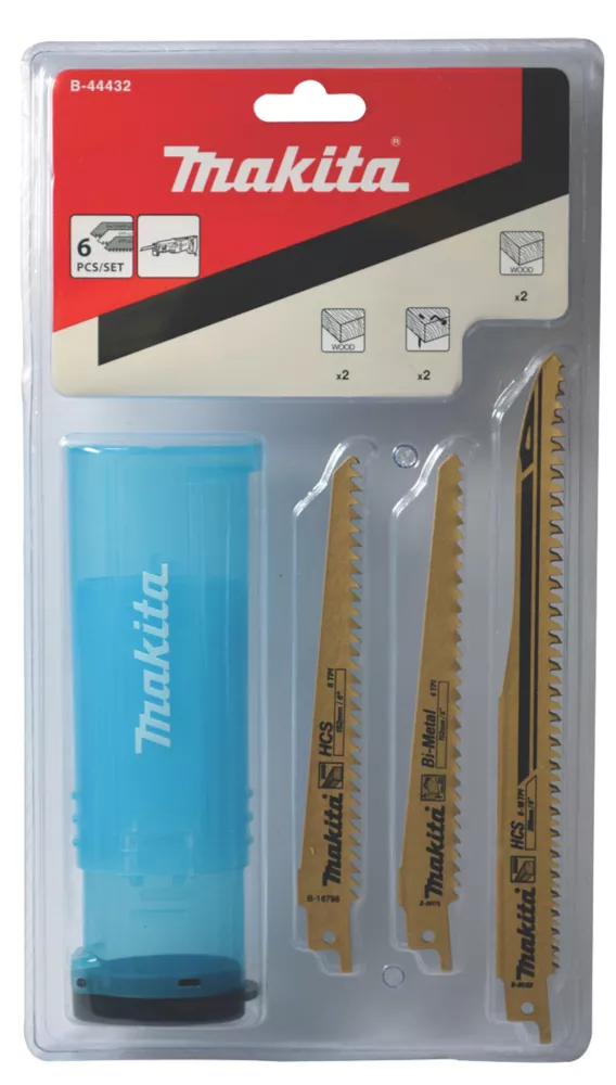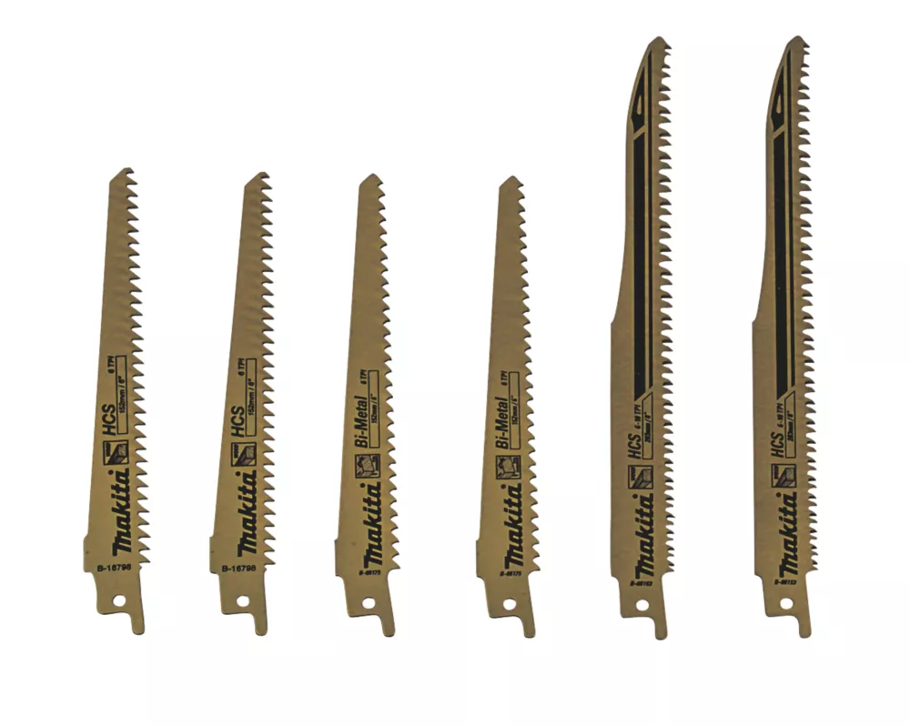 Reciprocating saw blade set comprises 2 x 203mm 6-10tpi blades with a tooth pitch of 2.4-4mm, designed for wood, construction timber, plywood, MDF and plastic; 2 x 152mm 6tpi blades witha tooth pitch of 4.3mm, designed for softwood, chipboard and wood core plywood; and 2 x 152mm 6tpi blades with a tooth pitch of 4.3mm, designed for wood with nails. Supplied in a storage tube.