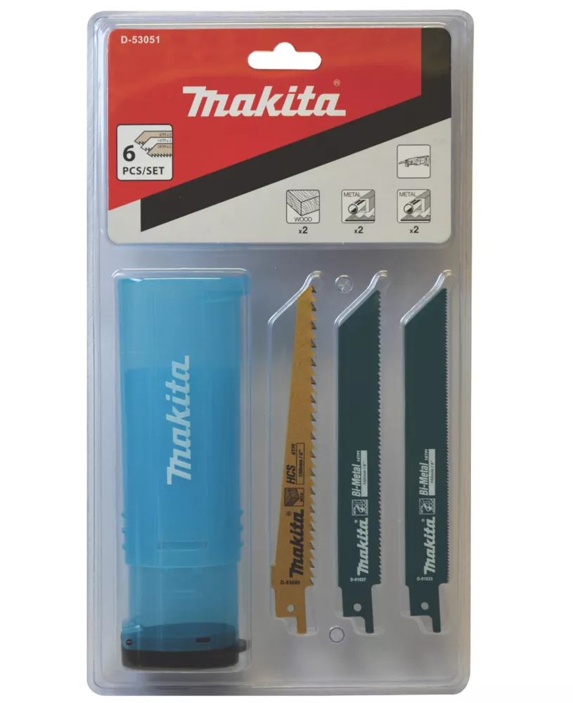 Reciprocating saw blade set comprises 2 x 150mm 6tpi blades with a tooth pitch of 4.2mm, designed for wood; 2 x 150mm 14tpi blades with a tooth pitch of 1.8mm, designed for 3-8mm metal plates and10-100mm pipe; and 2 x 150mm 18tpi blades with a tooth pitch of 1.4mm, designed for 1.5-4mm metal plates and 5-100mm pipe. Supplied in a storage tube.