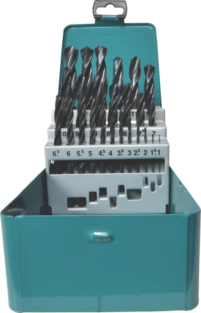 High rotational precision HSS-R, suitable for drilling in steel and cast iron, alloyed and unalloyed up to 900N/mm tensile strength, grey cast, malleable cast iron, die-cast metal, iron sinter, nickel-silver, graphite cast iron, short chipping aluminium alloys, bronze, brass and hard plastics. Contains right-hand cutting twist drill bits with 118° point angle and shank equal to the drill bit diameter. Supplied in a metal box with pop-up display of the drills for easier selection.