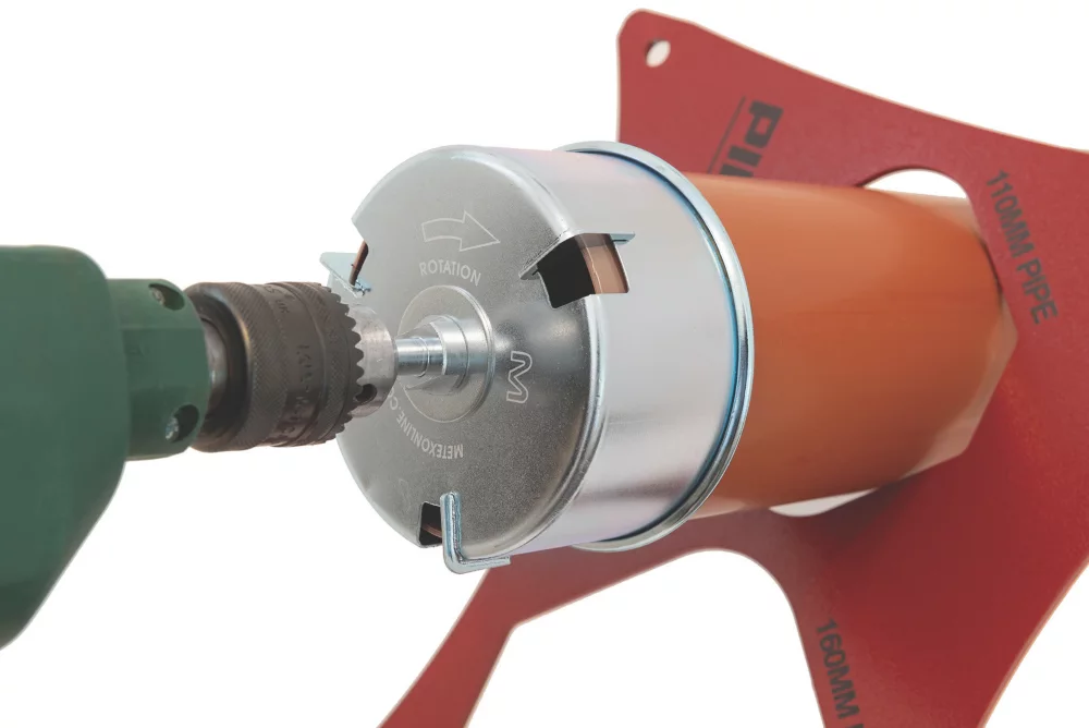 Applies the required 15° chamfer to any 110mm PVC pipe including drain and soil pipes in seconds. Works with a power drill by mounting the male spigot into the drill chuck.