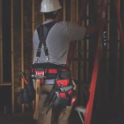 Contractor rig featuring 4-point padded harness for weight distribution and padded, breathable belt to provide comfort and jobsite performance. Integrated handle allows easy transport of the pouch and provides easy mounting point on common jobsite materials. Also features strong, double-stitched riveted seams and metal attachments allowing straps to be added. Ideal for keeping small tools at hand on the jobsite, hands-free. 1680D ballistic nylon construction.