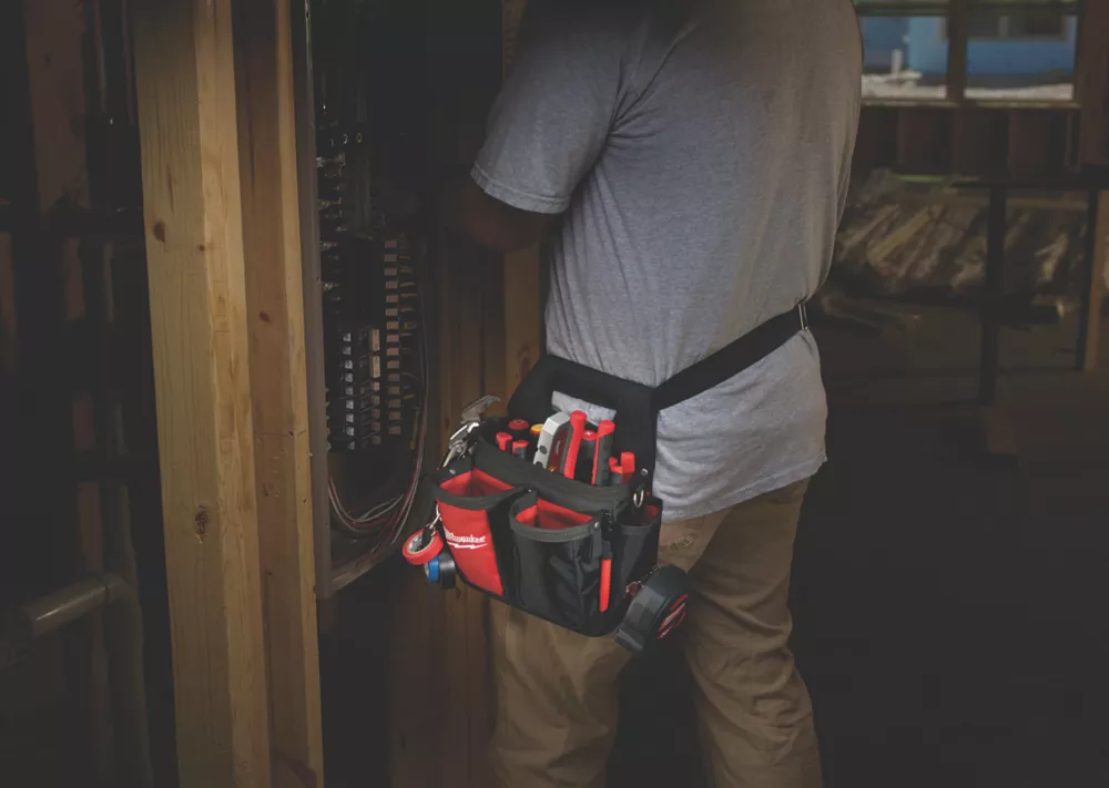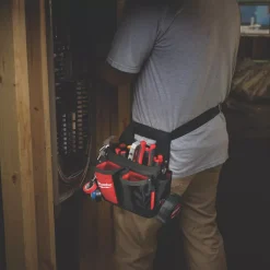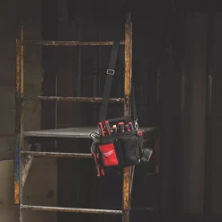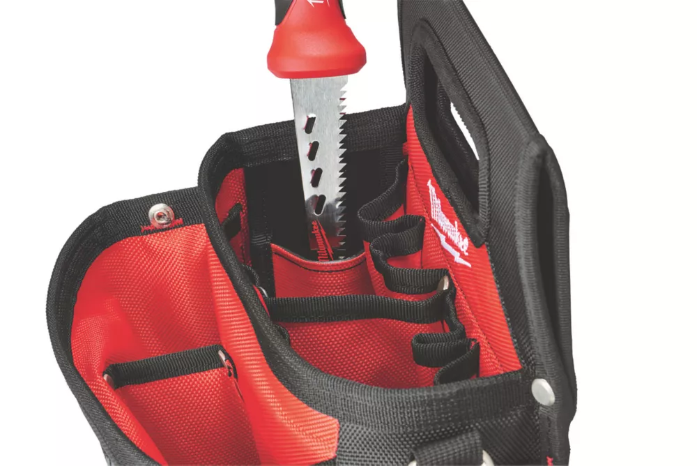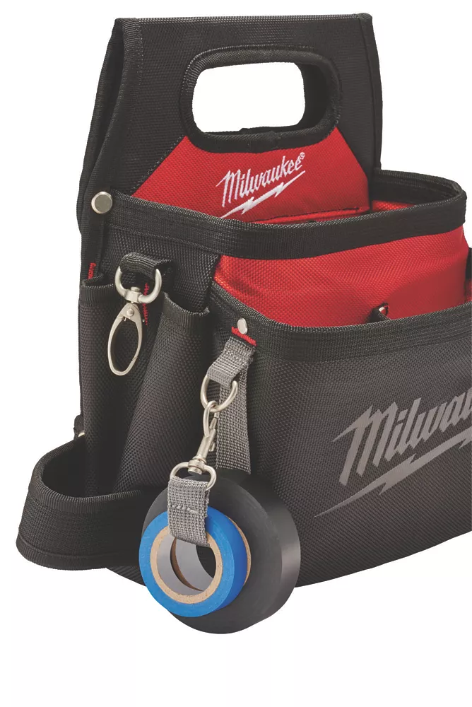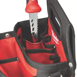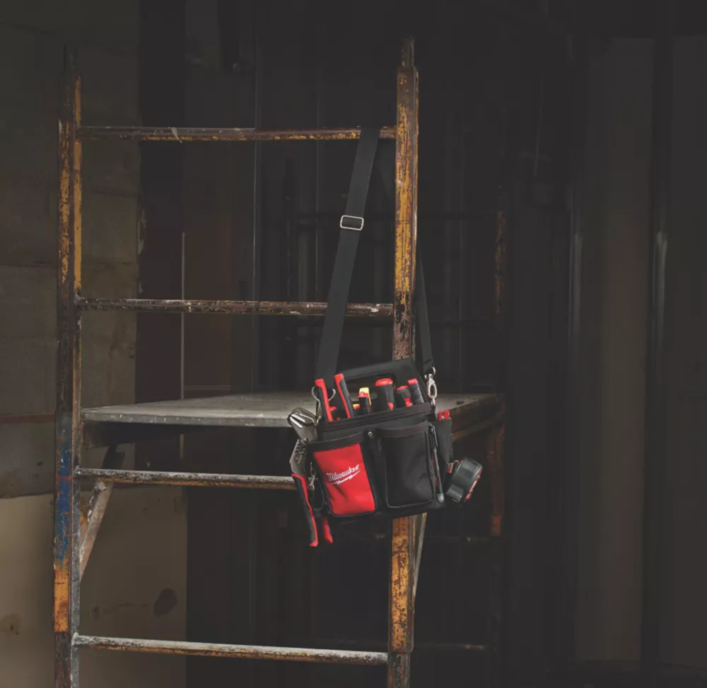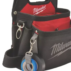 Made from 1680D ballistic nylon and is double-stitched with strong riveted seams to provide high durability. The integrated handle allows for easier transport and provides an easy mounting point on common jobsite materials. Solid base to stop tools from falling out and allows the bag to stand, even when fully loaded. Centre-mounted metal D-rings allow bag to hang evenly from a shoulder strap. Metal tape measure clip securely stores tape for easy access.