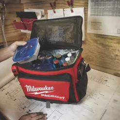 Jobsite cooler for the PACKOUT modular storage system. IP65 food-grade leak-proof liner. Extra insulation for keeping food and drinks cool on a hot day at the jobsite for up to 24 hours. Impact-resistant polymer base protects contents from water and dirt and allows backpack to stand up. Shoulder strap for easy transport.