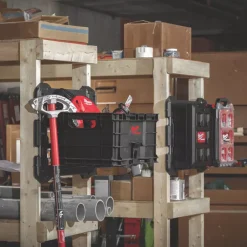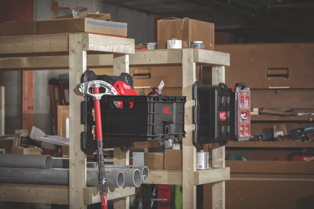 Mounting plate for modular storage system. Changes PACKOUT kit into a stationary storage solution for the workshop or vehicle. Can be mounted to walls or flooring.