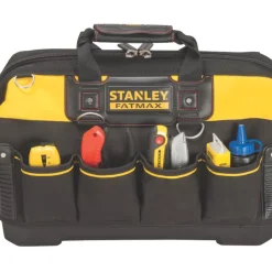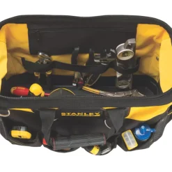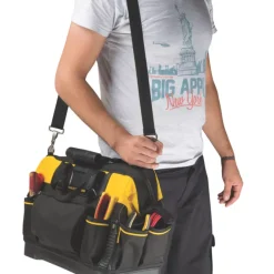 18″ (457mm). Heavy duty, 600 denier fabric tool bag with leather reinforcements for long lasting durability. Includes interior tool loops.