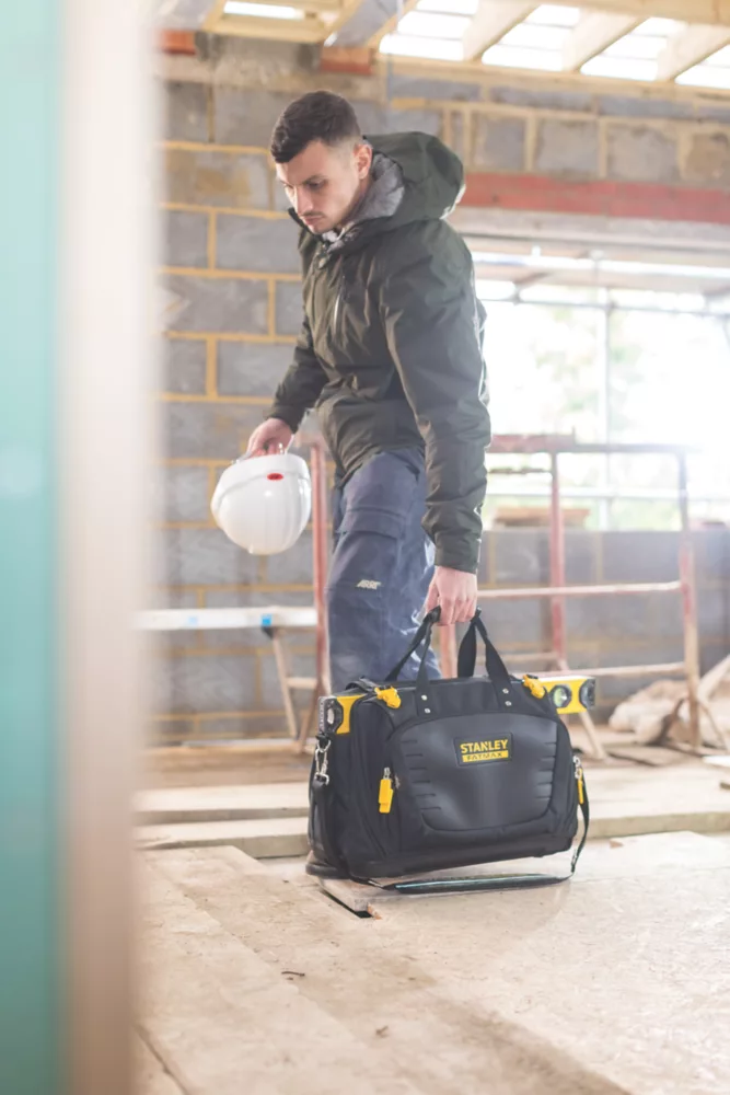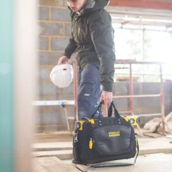 Strong and durable open mouth tool bag with a rigid waterproof plastic base and tarpaulin construction. Features 2 zippered compartments and a separate compartment for personal belongings.