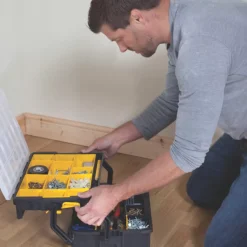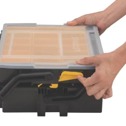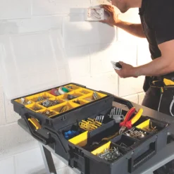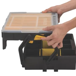 Multipurpose organiser designed to offer a flexible solution for storing tools, accessories, small parts and fixings. Storage can be customised with a combination of removable cups and dividers. Designed with a carry handle in a suitcase configuration to maximise storage space. With a clear lid allowing visibility of contents, which lifts open to allow access to both sections. Can be connected to the Sortmaster Junior Organiser and carried together.