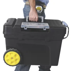 Tool chest with removable organiser for small parts and accessories. Soft-grip handle for comfort. V-groove on lid to aid the sawing of pipes and timber.