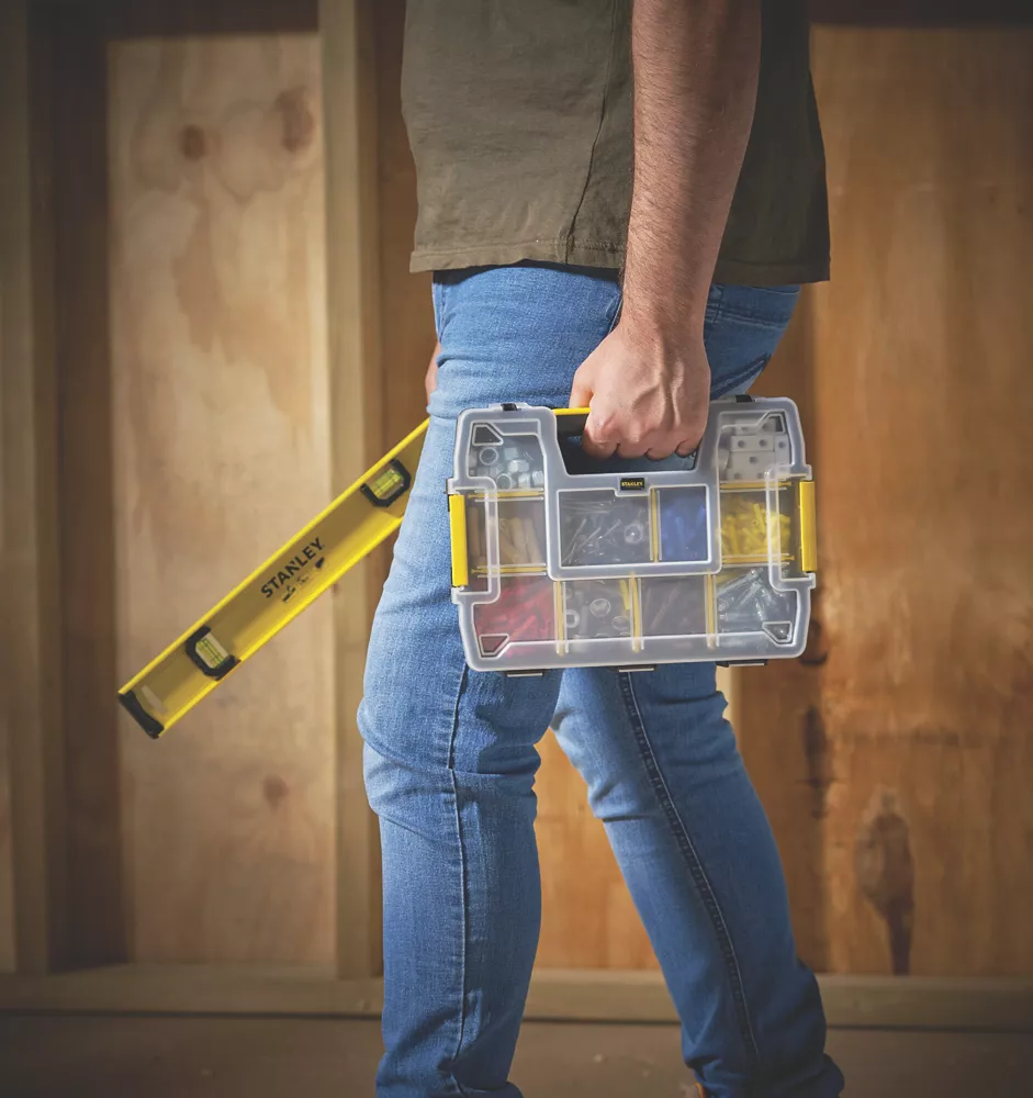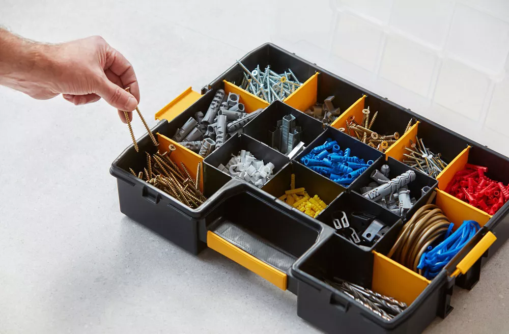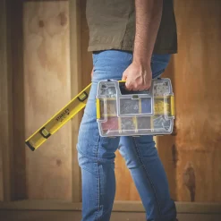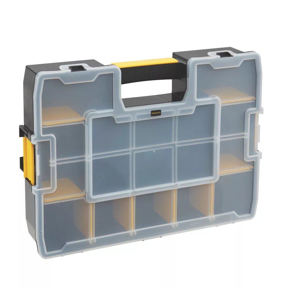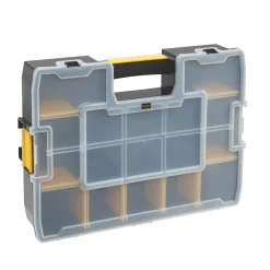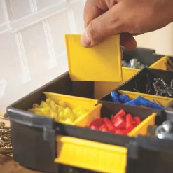 Customisable, removable dividers allow ultimate flexibility, incorporating 1 x large and 2 x small organisers. Provides up to 1024 compartment configurations and the 90° compartments allow storage of hand tools and small parts. The lid lock ensures secure transit and the clever design stops items moving between compartments.