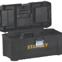 Weather-resistant plastic tool box with ergonomic, metal latches. Contains small top organiser for the storage of small parts. Top padlock eye enables full locking.