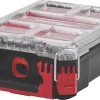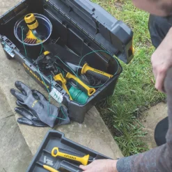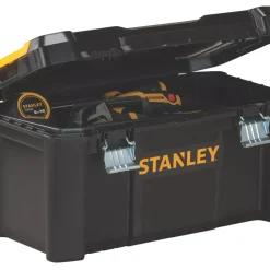 Plastic tool box with latch. Includes 2 x organisers in the lid and removable tote tray for storing small tools and accessories.