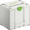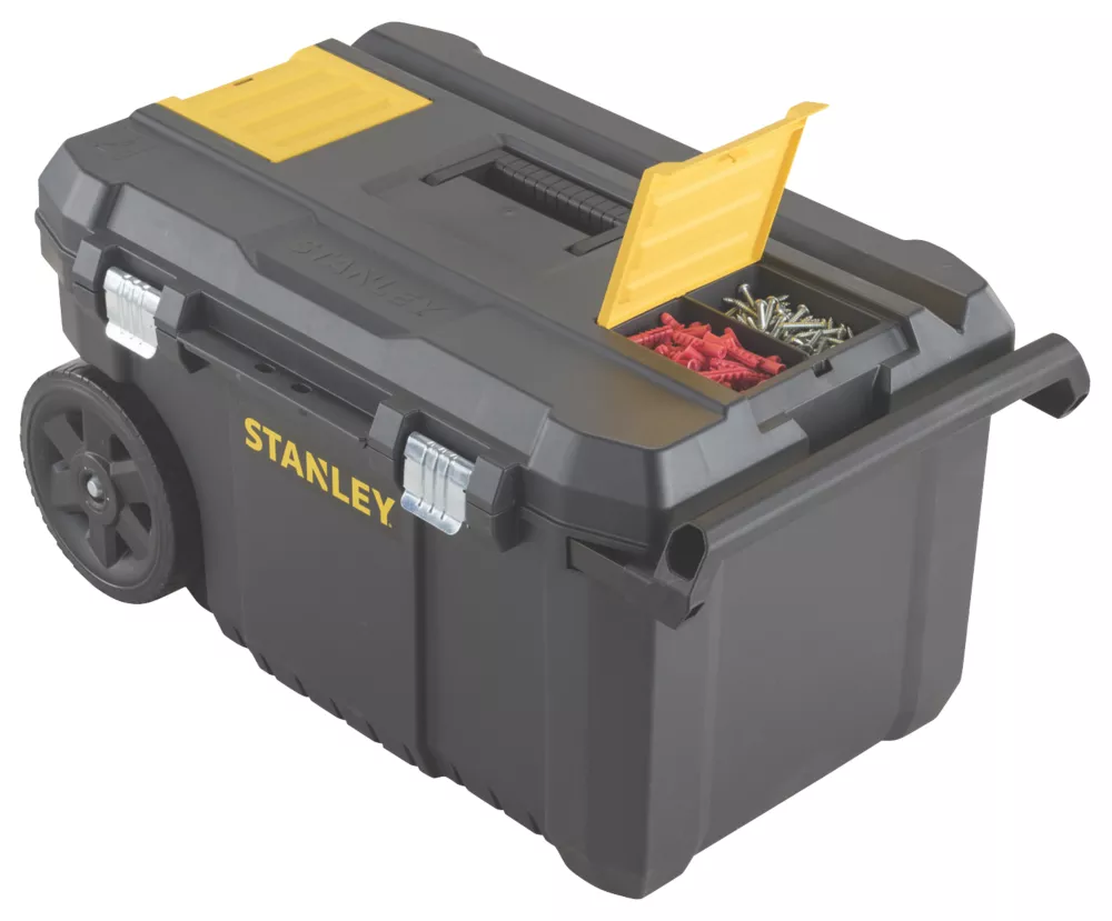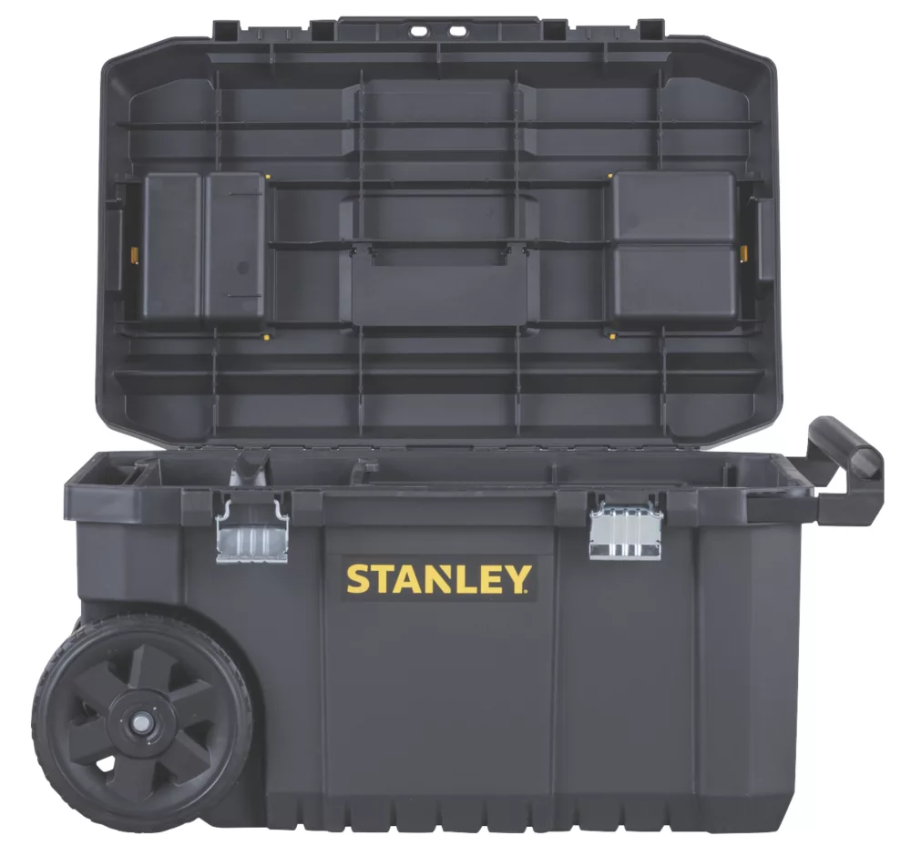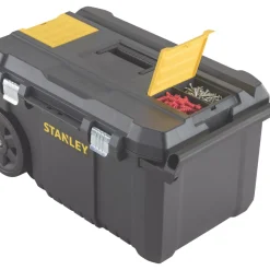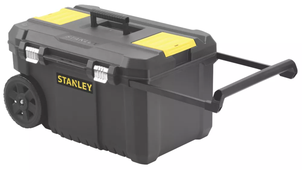 Large, waterproof tool chest with 7″ wheels and telescopic handle. Features an integral V-groove for convenient timber cutting as well as organisers for small bits and accessories. Plastic construction. 50Ltr capacity.