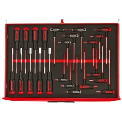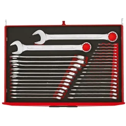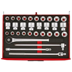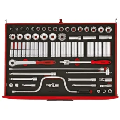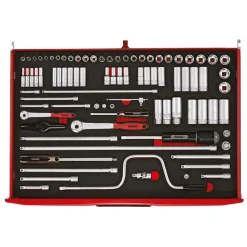 A comprehensive tool kit with all tools laid out in 2-colour pre-cut EVA foam which clearly shows if any tools are not in the correct place. Supplied in a Teng Tools TC805NFX full-depth 5-drawer ball-bearing top box with lockable cover which includes an aluminium handle, combination lock, heavy duty carrying handles at the ends and rubber feet under the top box. Also includes a TCW806N1 6-drawer ball bearing roller cabinet with 2 fixed castors and 2 swivel castors with brakes, combination lock, heavy duty handles for transporting and an ABS top mat with small compartments.