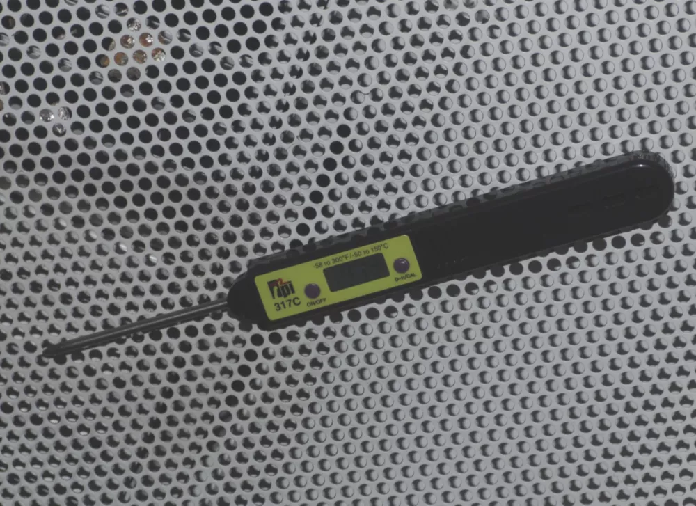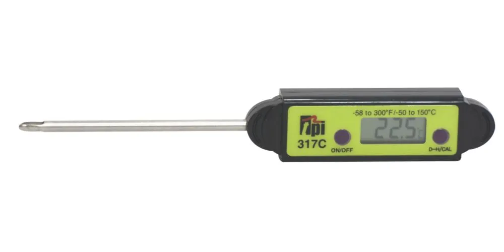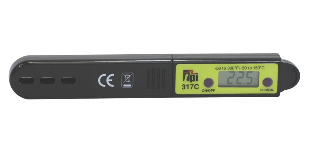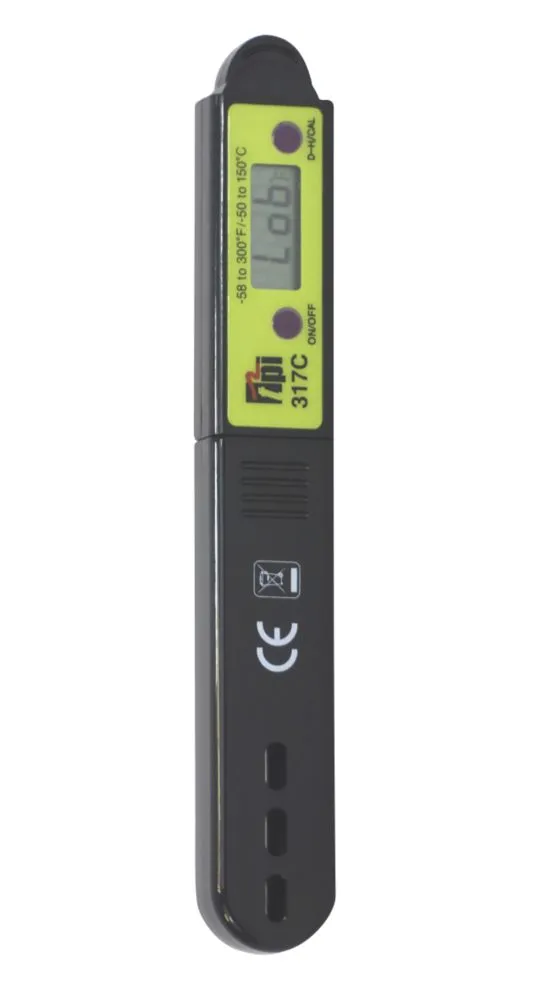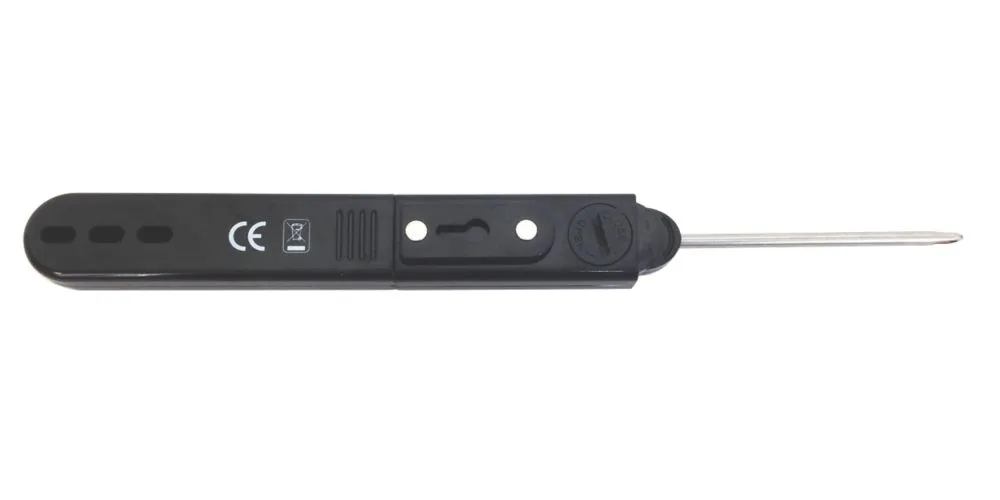 Pocket digital thermometer for quick and accurate measuring of ambient air temperatures. Features protective sheath which also connects on reverse end to double up as extended handle.