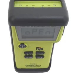 Dual input digital ‘K’ type thermometer with auto field calibration functionality. Quick and easy calibration in less than 10 seconds in ice water to +/-1°F accuracy. Measure 2 temperatures simultaneously and scroll through T1, T2 and differential with data hold and min/max record features. Temperature range of -50 to 2462°C. Supplied with handy carry pouch.