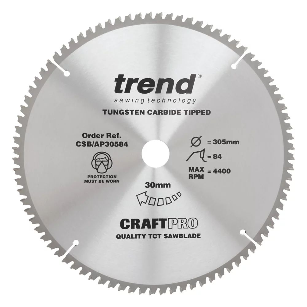 TCP (Triple Chip Proflile) microgranular tungsten carbide-tipped Craft Pro specialist saw blade for clean cuts and a professional finish. 2mm plate thickness for safe, ultra-fine cutting of plastics and alloys with mitre and table saws (ideal for cutting aluminium and UPVC window components). Premium quality silverbraze tips are precision-ground for high-end performance and edge retention. Blade utilises a high grade alloy steel plate, hardened and tempered to maintain flat and true performance for accuracy and longevity.