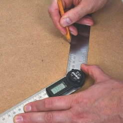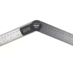 Digital rule for quickly calculating angles. Stainless steel construction with metric and imperial scales. Easy to operate with 2 press buttons and rule locking function. Measures from 0-360° and folds out to 400mm length. Ideal for woodworking and construction.