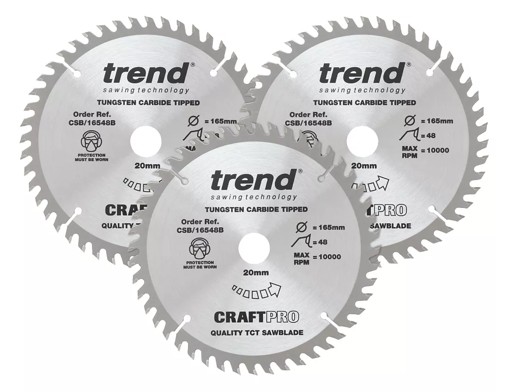 Triple pack of same diameter saw blades for use in a plunge saw to achieve a professional finish in soft and hard wood, plywood, soft fibre, plasterboard, stone fibre board, cement-bonded board and particle board. Microgranular tungsten carbide-tipped for cutting abrasive materials. Precision ground, high grade steel plate body, to maintain flatness. Alternate top bevel tooth form.